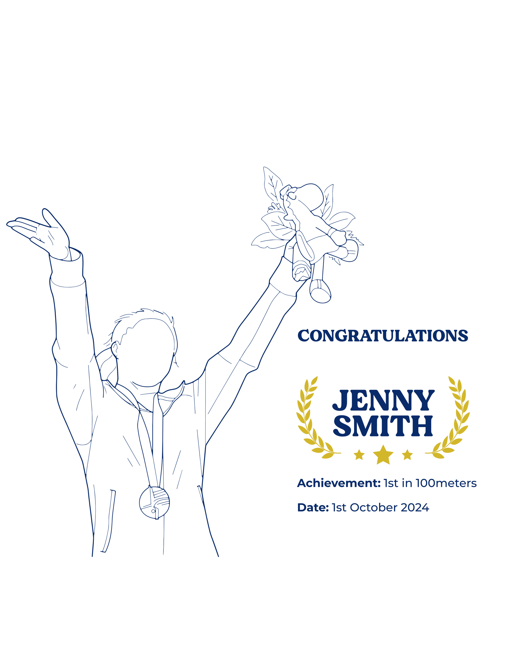 Each shirt features a clean embroidered design representing athletics, personalised with your chosen message, date and the specific achievement. Whether it’s a school sports day victory, a county track event, or a marathon finish, you can honour the moment with words that matter.