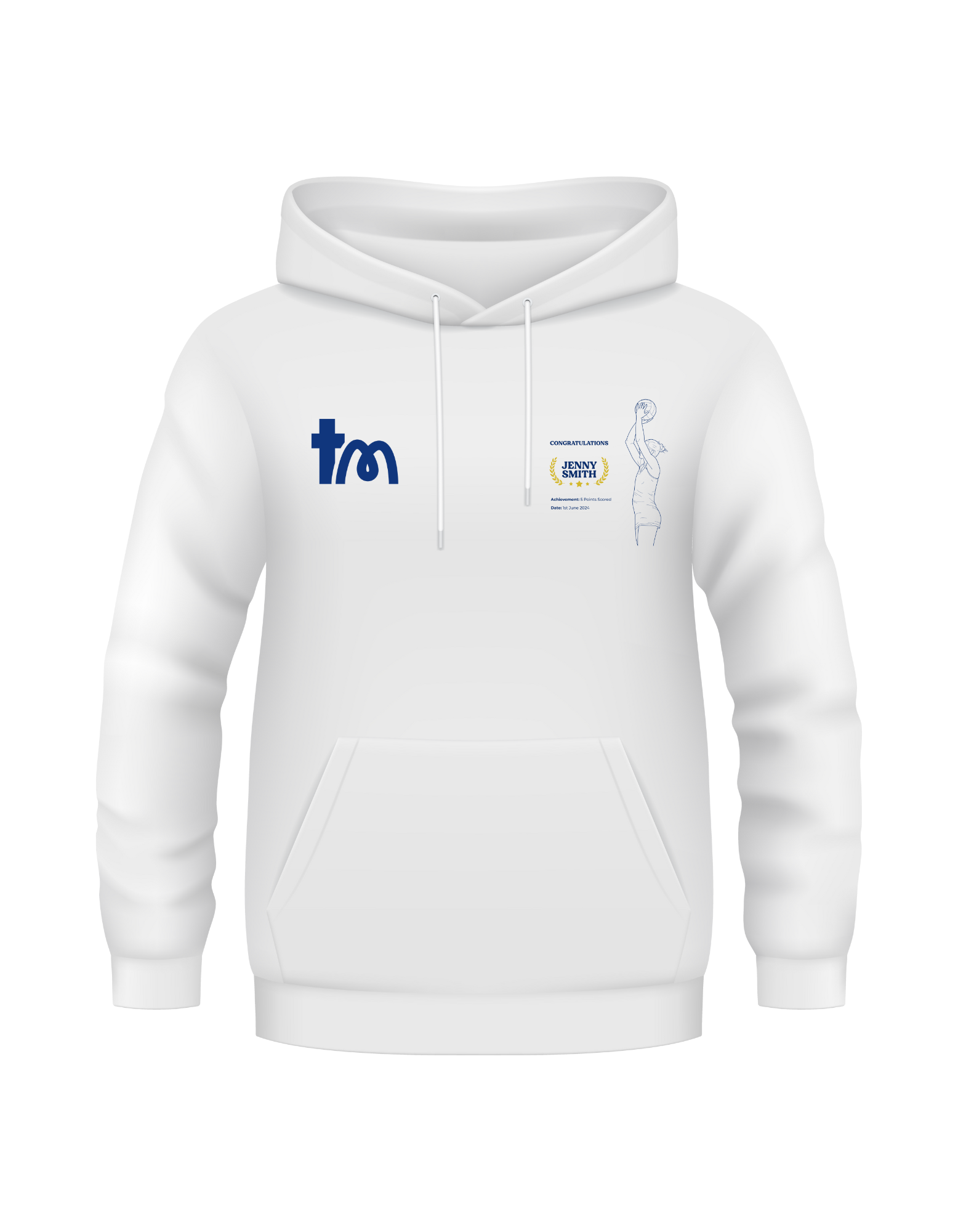Made from heavyweight fabric with a soft, cosy lining, this hoodie offers warmth and comfort while showcasing your proudest achievement. The embroidery features a detailed netball motif alongside your chosen details, including the achievement, the date, and a short message, making every hoodie truly unique.