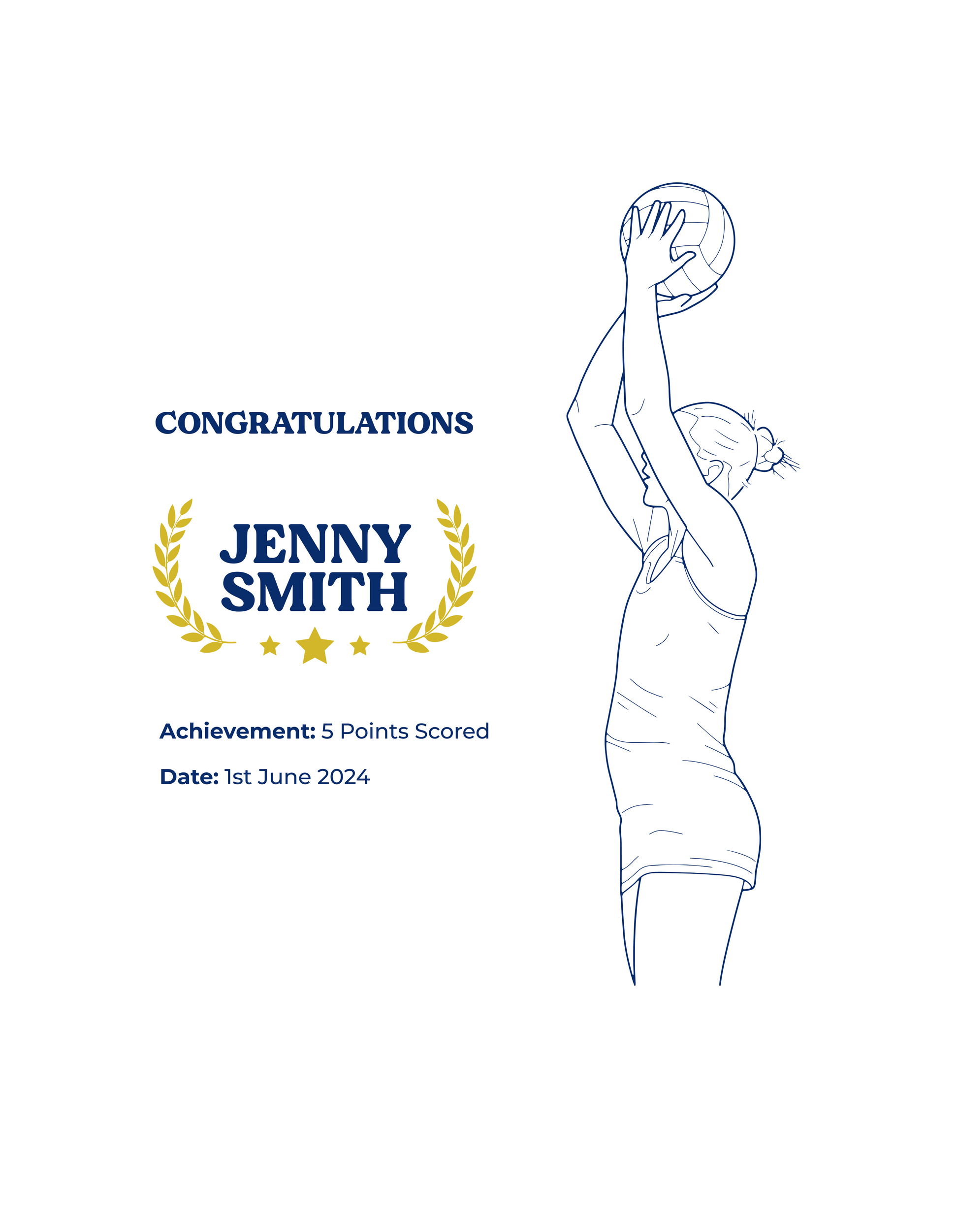 • Personalised embroidery with netball design, player name, achievement, date, and short message