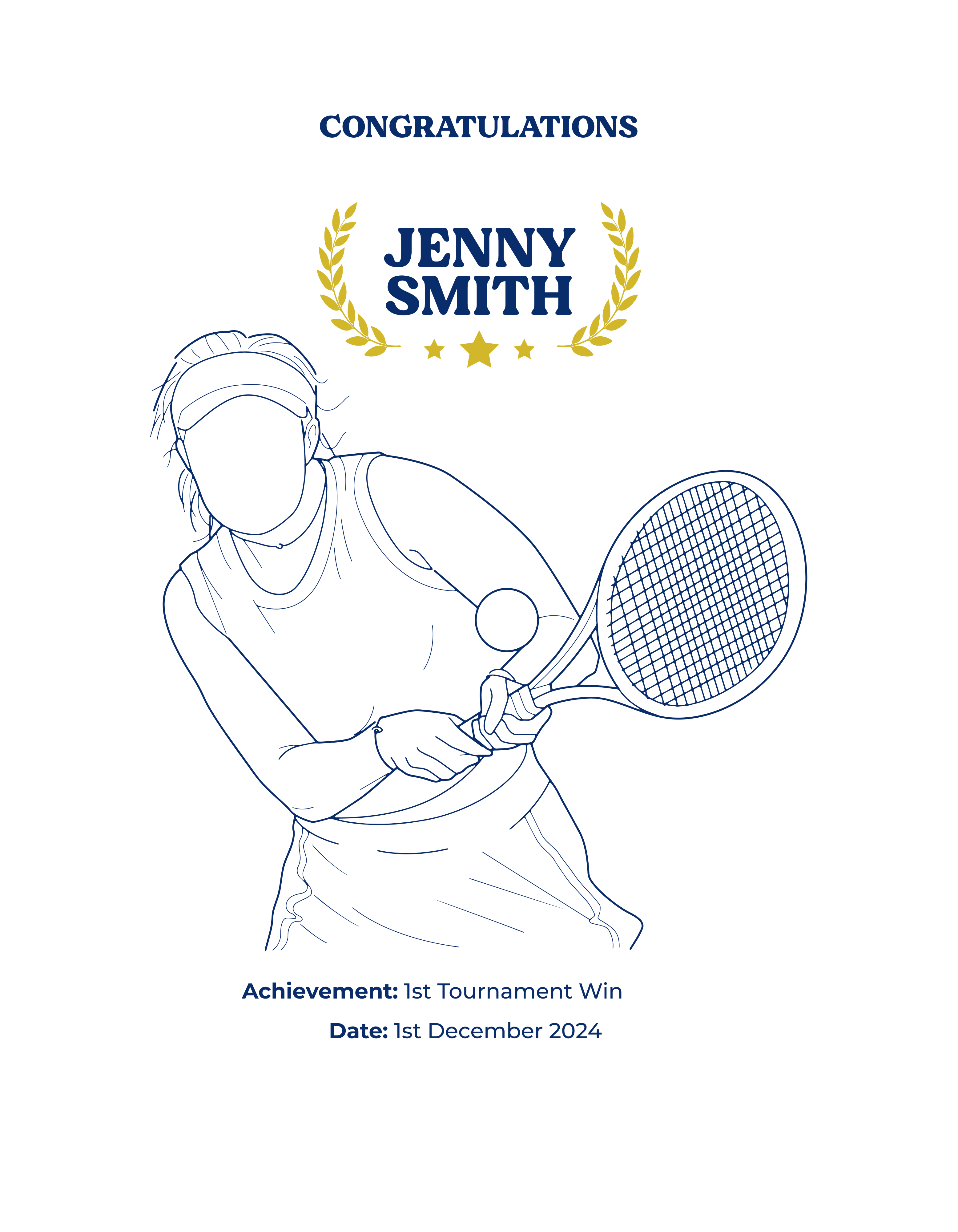• Unique Personalised Keepsake: Features a high-quality embroidered tennis motif, customised with the athlete's name, their achievement, the date of their success, and a short message, creating a deeply meaningful and unique tribute to their victory on the court.